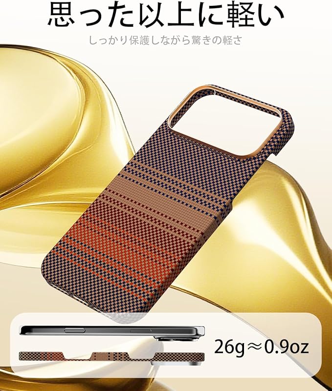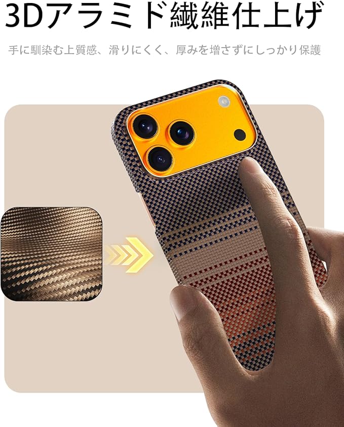 上質な色と手触りを、あなたの手に:まるで夕陽が沈む瞬間を切り取ったような、幻想的なサンセットカラーiphone17プロマックス ケース が、持つだけで視線を集めます、600Dアラミド繊維の編み込みは、触れるたびに立体感を感じられます、どの角度から見ても息をのむほど美しい高級ケース