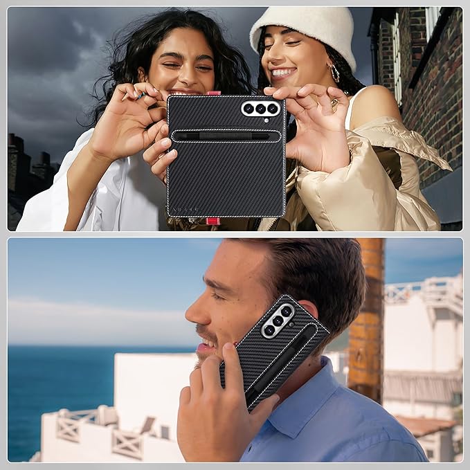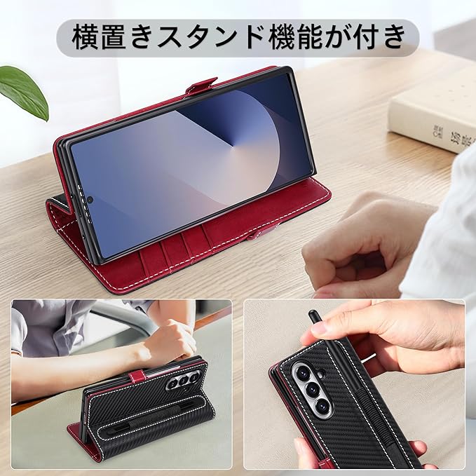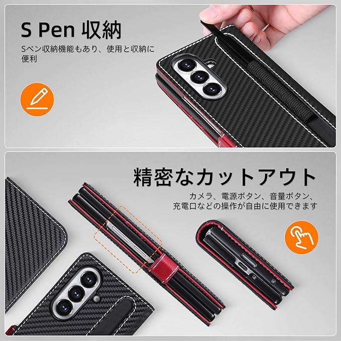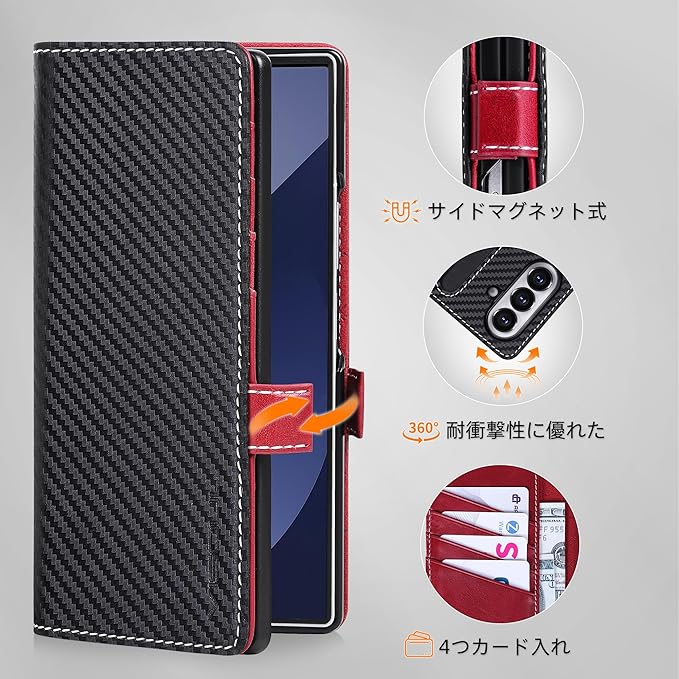 VISOUL Galaxy Z Fold 7 対応 ケース 手帳型 本革 サイドグネット式 ギャラクシー Z Fold 7スマホケース Samsung レザーケース 折りたたみ カード収納 耐衝撃 スタンド付き カーボンレザー ブラック レッド Galaxy Z Fold 7