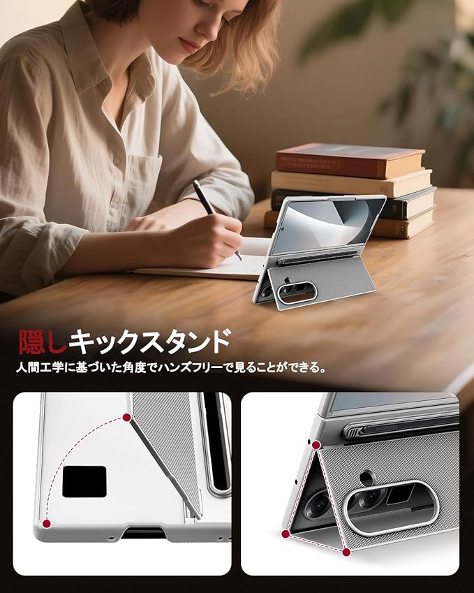 【キックスタンド付き・利便性】このfold7 Coverには収納可能な折りたたみ式スタンドが付属しており、スタンドを開いて携帯電話をデスクトップに水平に置き、ビデオを見たり、セルフィーを撮ったりすることができます。収納式の折りたたみスタンドは、ケースをよりシンプルでエレガントに見せ、携帯の利便性も向上させます。
