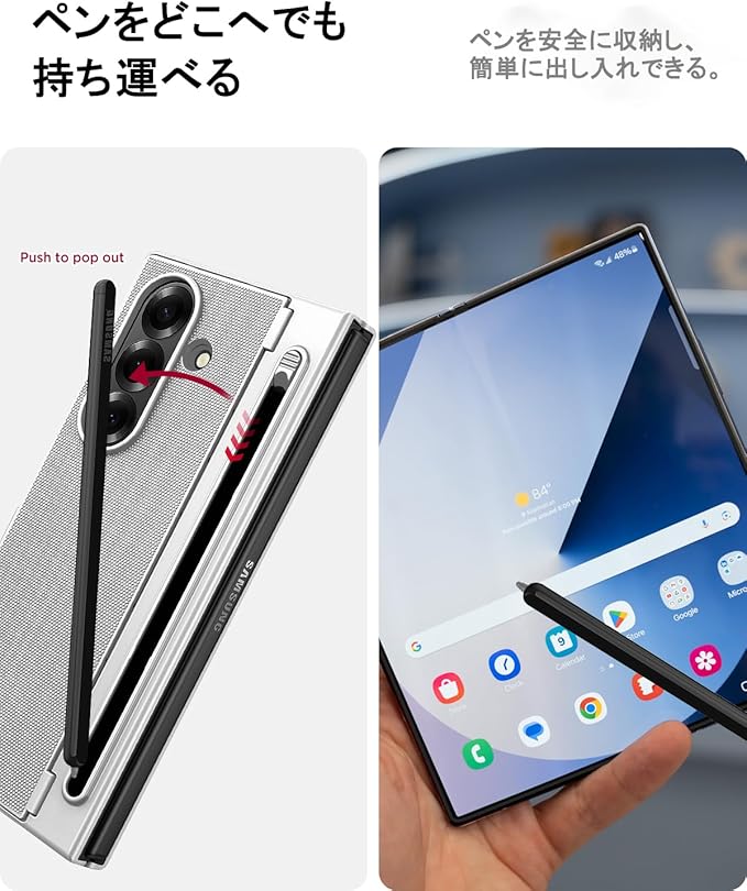 【Sペン付き・ペン収納スロット内蔵】この Fold7携帯ケースには、ペンを収納できるペンスロットが付いた携帯電話にフィットするタッチペンが付いています。このSペンは、大画面を使いながらメモを取ったり、絵を描いたり、ゲームをしたりと、両手を自由に使うことができます。収納スロットにペンを入れれば、仕事でも遊びでも、いつでもどこでもペンを持ち運ぶことができ、とても便利です!