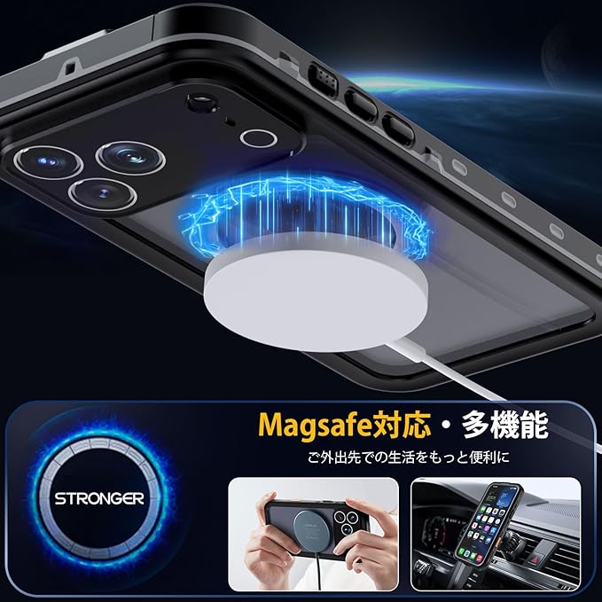 【MagSafe対応・強力な磁力吸着】強力なN52マグネットを搭載しており、マグセーフ充電器やその他様々なマグセーフマグネットアクセサリーをしっかりと保持します。先進的な磁気吸引力技術により、移動中の車内でも簡単に落ちることはありません。また、急速充電可能です。マグセーフアクセサリーとの完全な互換性があり、安心してお使いいただけます。