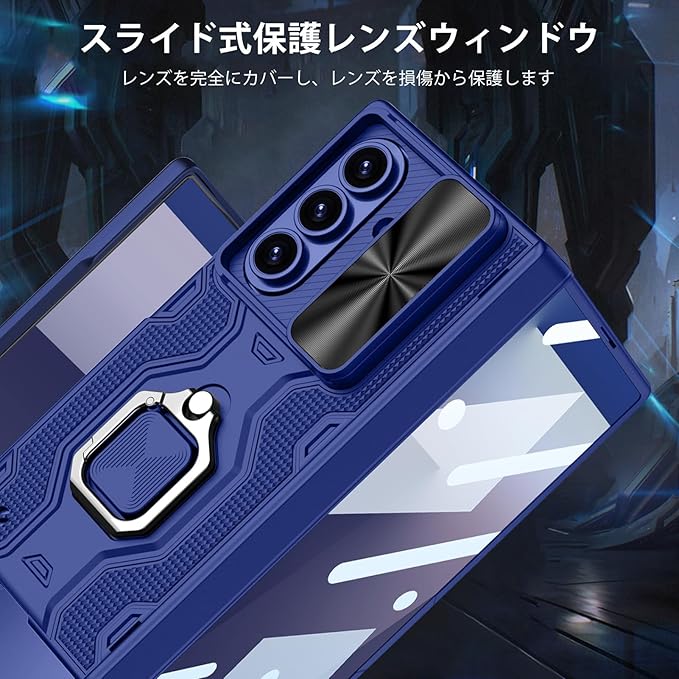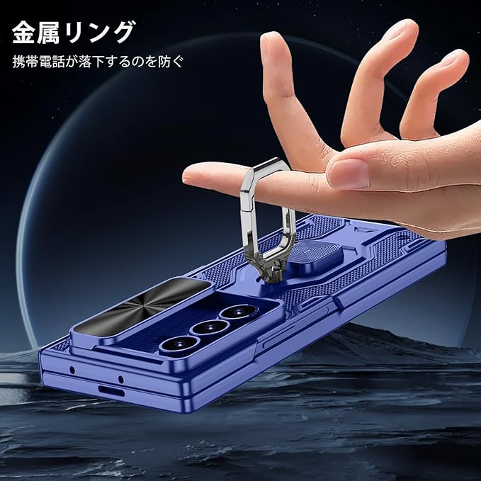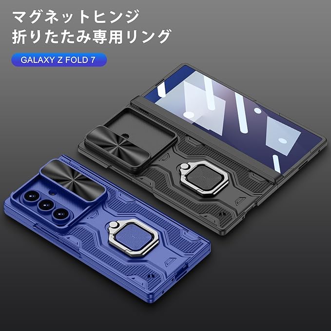 Galaxy Z Fold7 ケース 【ガラスフィルム付き】ギャラクシーゼットフォールド7ケース リングケース レンズ保護/スタンド機能/磁気ヒンジ/ストラップ付き/全身保護/耐衝撃/おしゃれ/落下防止 (ブルー)