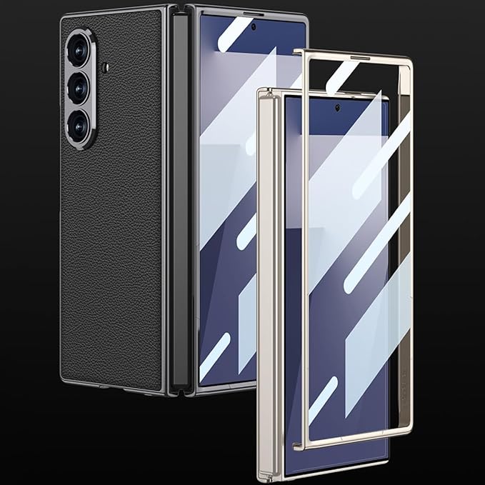 Galaxy Z Fold7専用 超薄軽量 ケース 3Dメッキフレーム レイシ模様のレザー加工 一体化強化ガラス ワイヤレス充電対応 全周囲保護 レンズ保護 キラキラ カバー 人気 可愛い 面白い スマホ 携帯電話 折りたたみ式手帳 耐衝撃 おしゃれ 個性 滑り防止 Beautycatcher - 限定黒