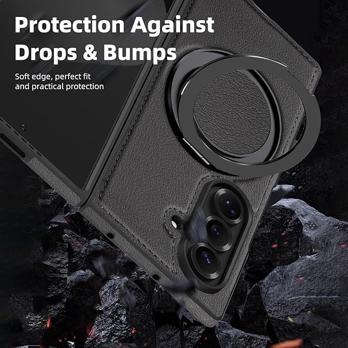 スマホ携帯ケース【Galaxy Z Fold7専用】金属360度回転スタンド付き 複合全包囲保護 ライチ柄レザー ソフトTPUフレームアル 超薄型 磁気ワイヤレス充電対応 精密フィット設計 カバー 人気 軽量 レンズ保護 個性 ユニーク 指紋防止 二層構造 豪華 おしゃれ 衝撃吸収 - Beautycatcher - 黒