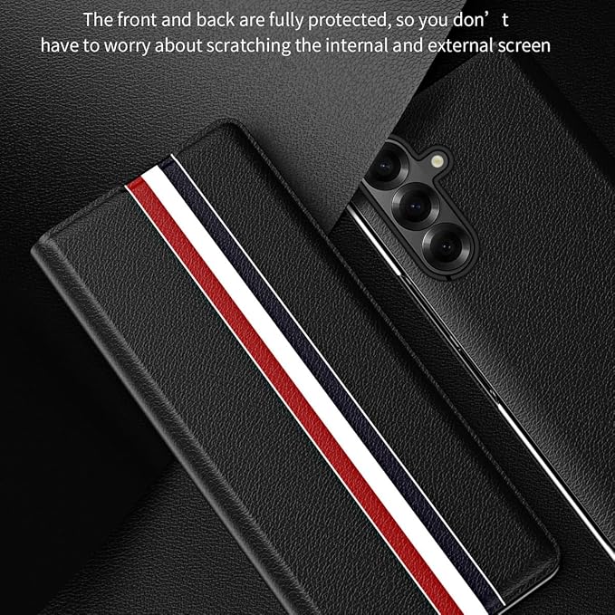 Galaxy Z Fold7専用開発の多機能手帳カバー。内装ベルベット/中層強化PC/表面高級PU皮革の三段階保護層が、繊細な機体保護と高級感を両立。360 画面保護システムは皮革面カバーと微凸設計を連携させ落下リスクを低減。革製折りたたみスタンド機能とカード収納ポケットでエンターテイメントと移動生活を最適化。凹凸のある皮革表面が滑りにくいグリップ性を提供し、ボタン/ポートへの精密アクセス設計と完全ワイヤレス充電互換性を実現。