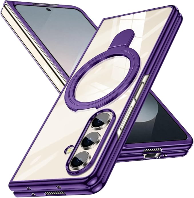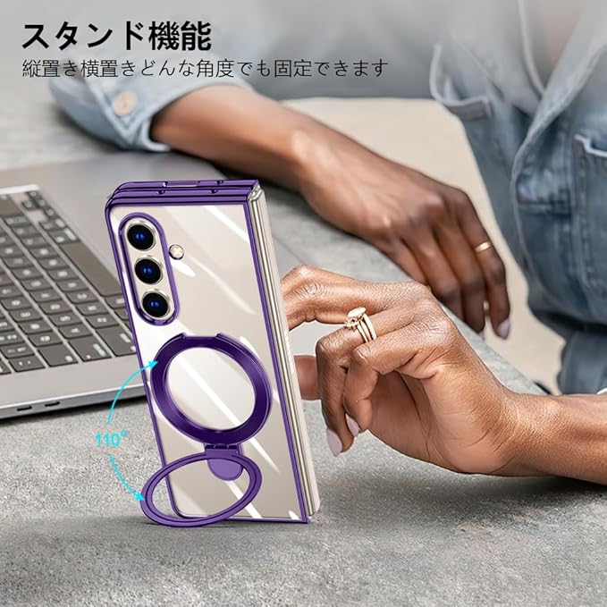 Galaxy Z Fold7 対応 ケース リング付き クリア メッキ加工 耐衝撃カバー スタンド機能 車載ホルダー PC 透明 軽量 電気メッキ 折りたたみ おしゃれ 一体型 ワイヤレス充電 ハード ギャラクシーZ フォールド7 5G 対応 スマホケース 紫 JP11-48