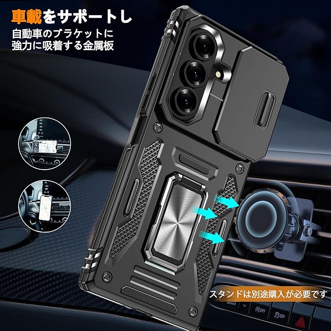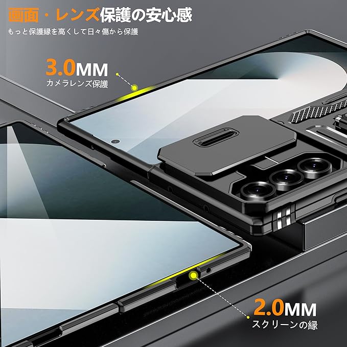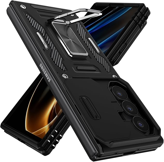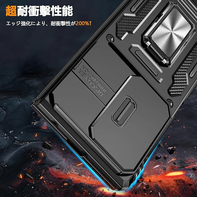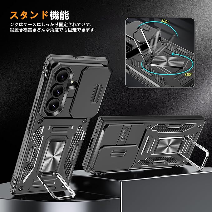 対応 Galaxy Z Fold7 用ケース リング付き スライド式カメラカバー 衝撃吸収 ギャラクシー Z フォールド7 5G ケース 耐衝撃 一体型落下防止 スタンド機能 PC+TPU 二重構造 防塵 薄型 軽量 360度回転 保護携帯カバー 黒 MJJ-1064-06-01
