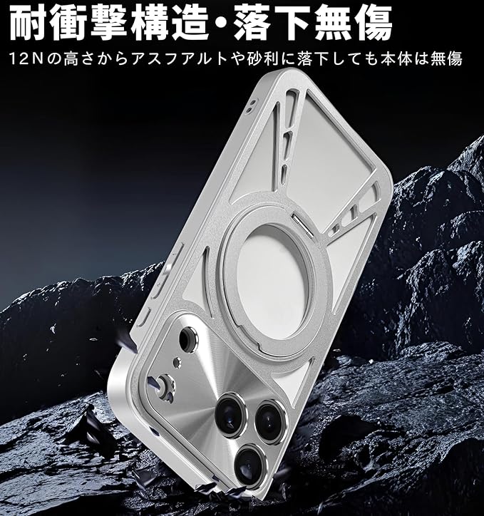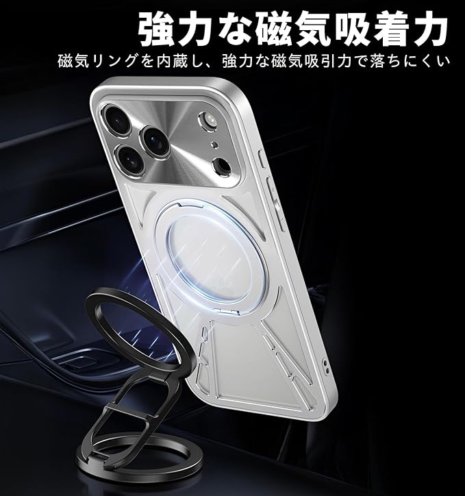 【対応機種】iPhone 17 Pro Max対応専用ケースです。誤差のない精密設計でボタンが押しやすいながら、デバイスにフィットします。対応機種を間違いないようにご購入お願い申し上げます。【360 回転スタンド】このiphone17Pro Max用ケースはアルミ合金リングと金属軸を採用で120 の開閉と360 回転が可能です。横起きあるいは縦起きはもちろん、絶妙なデザインで携帯を自由に多角度を調節でき、力よくスマホを支えて、映像や読書などに楽しめることができます。【航空用アルミニウム合金製ケ一ス】耐久性のある航空アルミニウム合金製で、一体型の保護ゴムパッドを備え、デバイスを損傷することなく強力な耐衝撃保護を提供します。薄型超軽量仕様ので、手に持っても重さを感じることが無い。ファッション性と実用性をを兼ね備えたデザインです。【Magsafe対応】マグネットが内蔵されている、MagSafe充電に対応しており、ケースを装着したままでもワイヤレス充電が可能。MagSafeアクセサリーともスムーズに連携でき、日常使いがさらに快適になります。【滑り防止・握り心地抜群】側面と内側は滑り止めPC素材で作られています。ベタつかず適度な柔らかさでクッション性があり、心地よく手にフィットして滑りにくいので落としてしまう心配が減ります。背面は通気口付きのアルミ合金製、耐久性や耐摩耗性に優れ、サラサラして触り心地もすごく良い質感です。