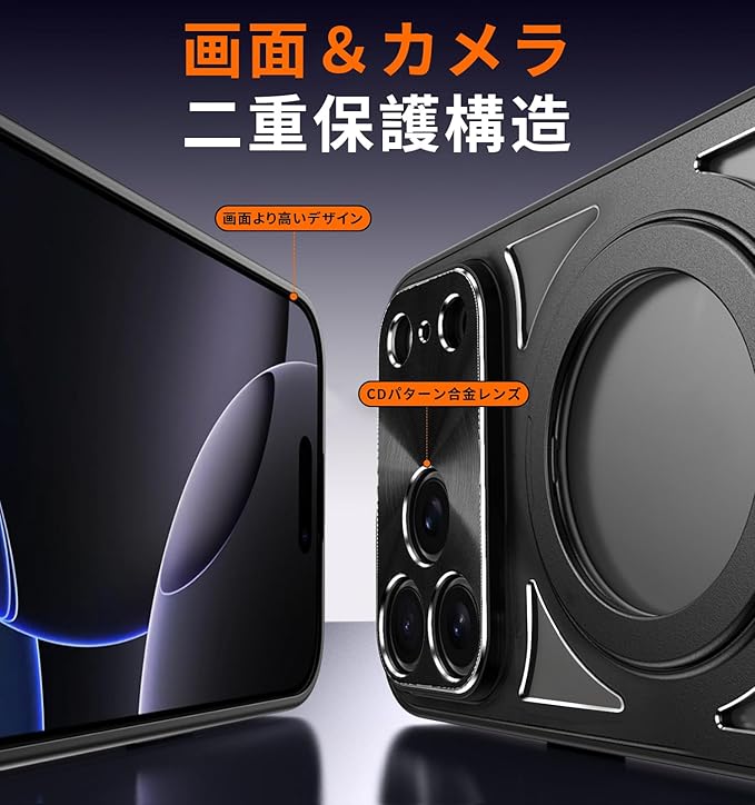 【360 回転スタンド】このiphone17Pro Max用ケースはアルミ合金リングと金属軸を採用で120 の開閉と360 回転が可能です。横起きあるいは縦起きはもちろん、絶妙なデザインで携帯を自由に多角度を調節でき、力よくスマホを支えて、映像や読書などに楽しめることができます。