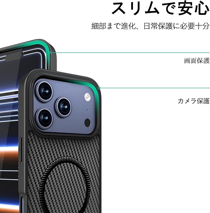 【二重構造 でしっかり保護】多重複合構造を採用し、四周は柔らかいシリコン素材、背面は内側に硬質PC、外側にカーボンファイバー調の硬質パネルを組み合わせ、端末を全方位からしっかり保護します。ケース 縁を画面・カメラより高く設計し、四隅の衝撃吸収で落下時のダメージを軽減できます。米軍MIL規格準拠の耐衝撃性能で、落下時の衝撃を効果的に吸収します。特別に強化され、通勤中の電車での手滑りや、デスクからの落下、ベッドサイドでの滑落など、日常の“うっかり”から大切なiPhone17ProMaxを守ります。