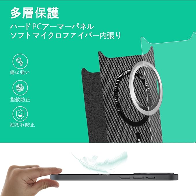 【 高級感のある素材 】背面には高級感のあるカーボンファイバーテクスチャを採用し、滑りにくいです。防油・防汚加工により指紋や汚れが付きにくく、長時間使用しても傷がつきにくく清潔に保てます。洗練されたデザインと高い耐久性を兼ね備え、オフィスやカフェ、外出先でも端末を美しく保ちながら安心して使用できます。
