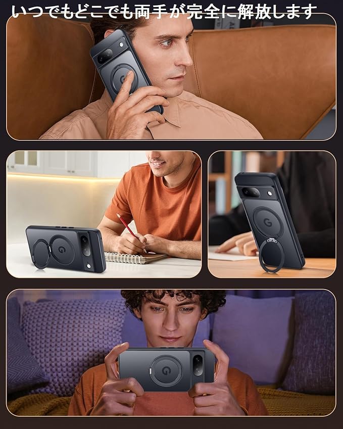 【多機能360 回転スタンド】多機能スタンドとリング一体型の斬新なデザインです。スタンドとケースが一体化しているので、いつでもどこでも両手が完全に解放します!横向きでの動画鑑賞も楽しめ、縦向きでのビデオ通話も快適です。ケースを開けるだけでスタンドの完成!指にかければリングも便利に使用でき!ケースを閉じれば背面はスマートに平坦に。使わない時はスマートに収めるから邪魔にならない。ストラップ穴付きのため、気分転換または携帯落下防止のため、いつも軽易にお好きなアクセサリーを使って飾れることができます。