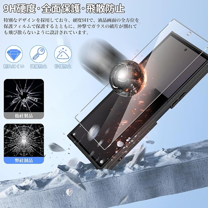 【ガラスフィルム付きの心配りある保護】日本製旭硝子材料を採用し、外部からの沖撃に強く、スマートフォンの画面への沖撃を防ぎます。また、特殊な飛散防止設計により、フィルムが割れても飛散せず、高い安全性を実現しています。スマートフォンを全面的に保護し、液晶画面の安全を守り、長く安心してお使いいただけます。