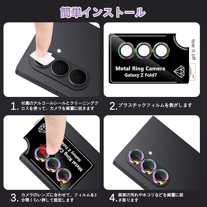 【対応機種】Samsung Galaxy Z Fold7に対応カメラ保護フィルムです。ご注意: 1. 取り付け中は、フィルムが完全に貼り付け後、2分間ぐらい強く押す必要があります、粘着剤が完全にカメラに貼る前、ポケットとかカバンに入れる時、引っかけないでください。2. 貼り付けの過程で、レンズ保護フィルムの接着に影響を与えるため、繰り返し取り外して貼り付けないでください