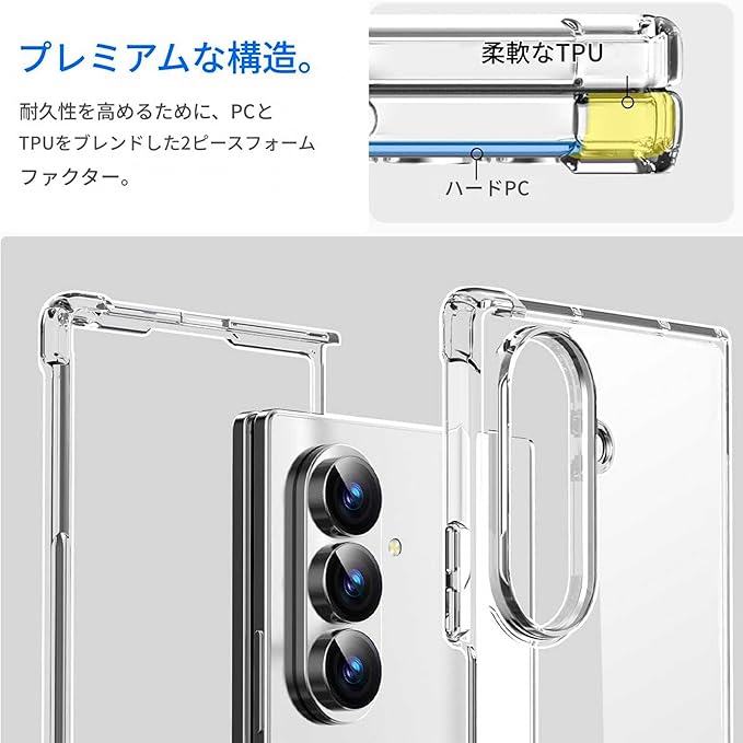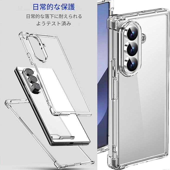 【Galaxy Z Fold7専用】ハイクオリティ透明保護ケースラップホール搭載【完全適合】galaxy z fold7専用デザイン 、弊社独自の3Dスキャン技術により、Galaxy Z Fold7の本体形状にピタリフィット。端末との隙間・浮きは一切なく、ボタンやカメラ、イヤホンジャックなどの各開口部も精密に加工。保護フィルムを貼った状態でも画面操作やカメラの動作に影響を与えません【衝撃から本体を完璧に守る】弊社独自開発の「2層アサイン構造」により、衝撃を物理的に分散・吸収。背面は剛性の高いPC素材で本体をガードし、側面には柔軟なTPUを配して衝撃エネルギーを効率的に緩和画面周囲は1mm、カメラレンズ周囲は2mmの段差設計を採用。端末を平置きした際に画面やレンズが直接平面と接触するリスクをゼロにし、微細なキズやスレ傷を防ぎます。さらに、ケース内面にはクッション性のある微細凹凸加工を施して本体への密着圧を軽減し、落下時の内部衝撃も最小限に抑えます【長期間透明感維持】galaxy z fold7 ケース黄変防止技術搭載 、最新ADM(Anti-Discoloration Material)処理を施したTPU素材を採用。紫外線や空気酸化に強く、長期使用しても黄色く変色しにくい。本体の美しいカラーをそのまま引き出し、高級感あふれるデザインをキープします表面には撥油・撥水コーティングを施しており、指紋や油汚れが付着しにくく、いつもさっぱりと清潔な状態が維持できます【極上のフィット感と使い心地 】galaxy z fold 7 ケース 軽量・スリムデザイン 、片手での操作も圧迫感なく、滑りにくいTPU素材が優れたホールド感を提供。固すぎず柔らかすぎず、長時間持っていても手ごろなフィット感。 側面の電源ボタンや音量調節ボタンは、凹みのないシームレスデザインで押し心地良好,装着したままの充電がスムーズに行えます【設計のこだわりポイント】ストラップホール:お好みのストラップを取り付け可能