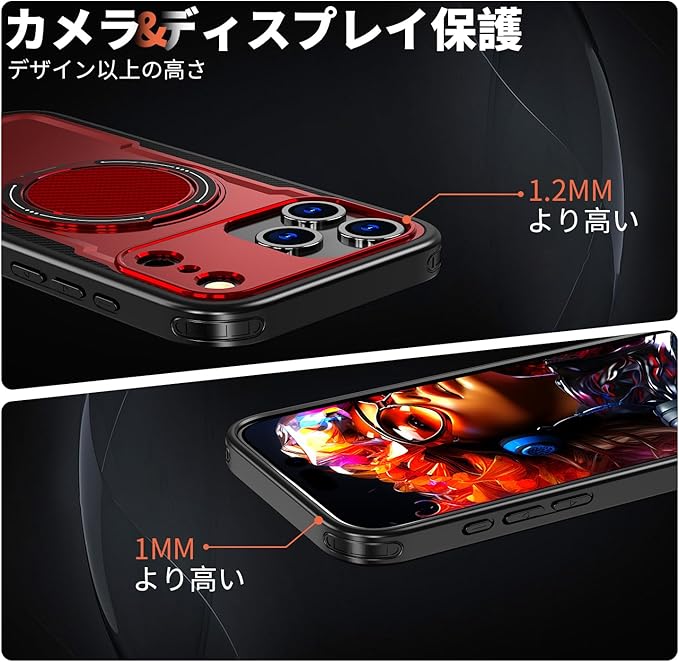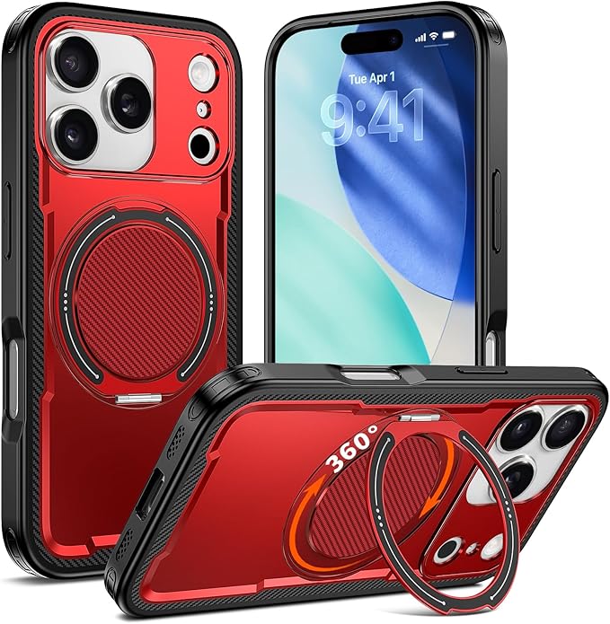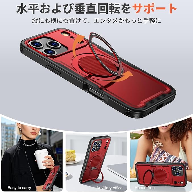 iPhone 17 Pro Max 用 ケース 耐衝撃 スタンド付き MagSafe対応 米軍MIL規格 いPhone 17 Pro Max カバー ワイヤレス充電 防指紋 縦横両対応 360 回転スタンド 炭素繊維テクスチャ ファッション レッド 121-IP17PM-03