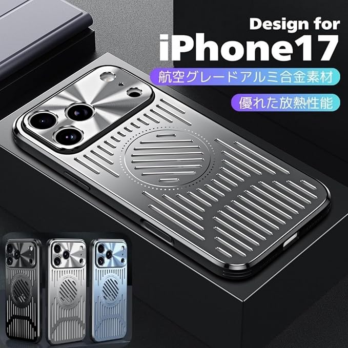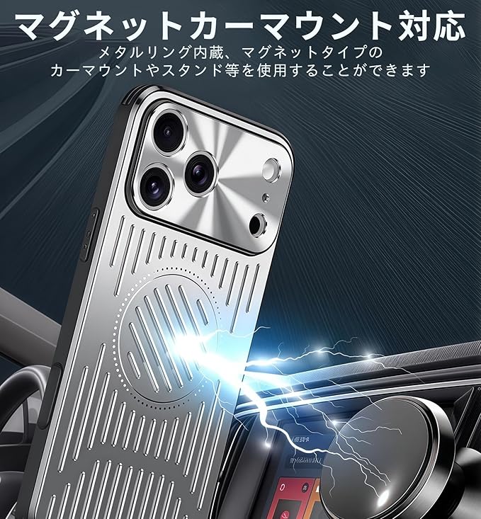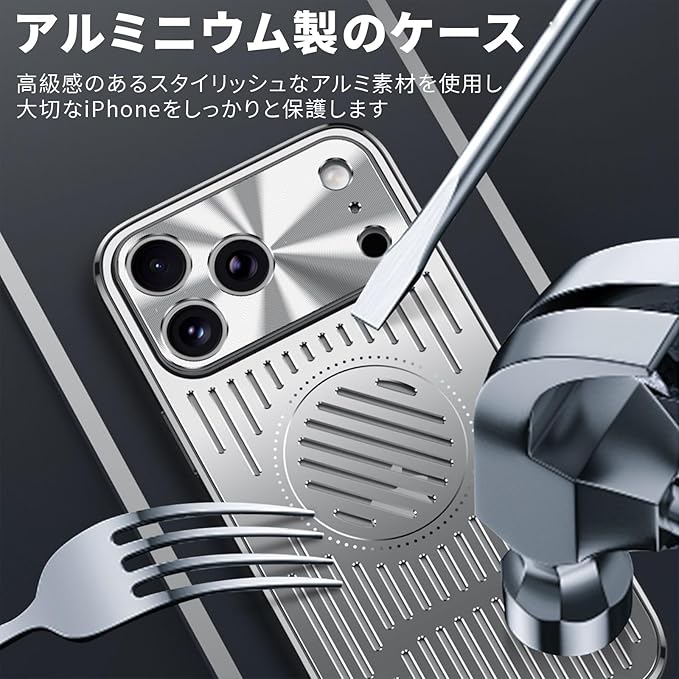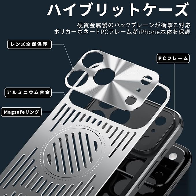 【放熱冷却機能】ケース 放熱メッシュ構造、長時間の使用で熱くなったアイフォンを効果的に冷却できます。この効果は、メッシュ構造によりエアフローを促進しiPhoneから出る熱の拡散を促進します、放熱を促すことによって得られ、iPhoneの動作パフォーマンスにも良い影響を与えま。ゲーミングスマホの愛好家やブロガーにオススメします ゲーミングスマホケース【航空用アルミニウム合金製ケ一ス】耐久性のある航空アルミニウム合金製で、一体型の保護ゴムパッドを備え、デバイスを損傷することなく強力な耐衝撃保護を提供します。薄型超軽量仕様ので、手に持っても重さを感じることが無い。ファッション性と実用性をを兼ね備えたデザインです。【Magsafe対応】マグネットが内蔵されている、MagSafe充電に対応しており、ケースを装着したままでもワイヤレス充電が可能。MagSafeアクセサリーともスムーズに連携でき、日常使いがさらに快適になります。【滑り防止・握り心地抜群】側面は滑り防止PC素材を採用。ベタつかず適度な柔らかさでクッション性があり、心地よく手にフィットして滑りにくいので落としてしまう心配が減ります。背面は通気口付きのアルミ合金製、耐久性や耐摩耗性に優れ、サラサラして触り心地もすごく良い質感です。【耐衝撃性抜群】カメラ上の 0.7mm の盛り上がったエッジはレンズの傷を防ぎ、画面上の 0.8mm のベゼルは携帯電話の画面への損傷を防ぎます。ケースの四隅に衝撃を吸収するエアバッグデザイン、頑丈な構造で、優れる耐衝撃性能。