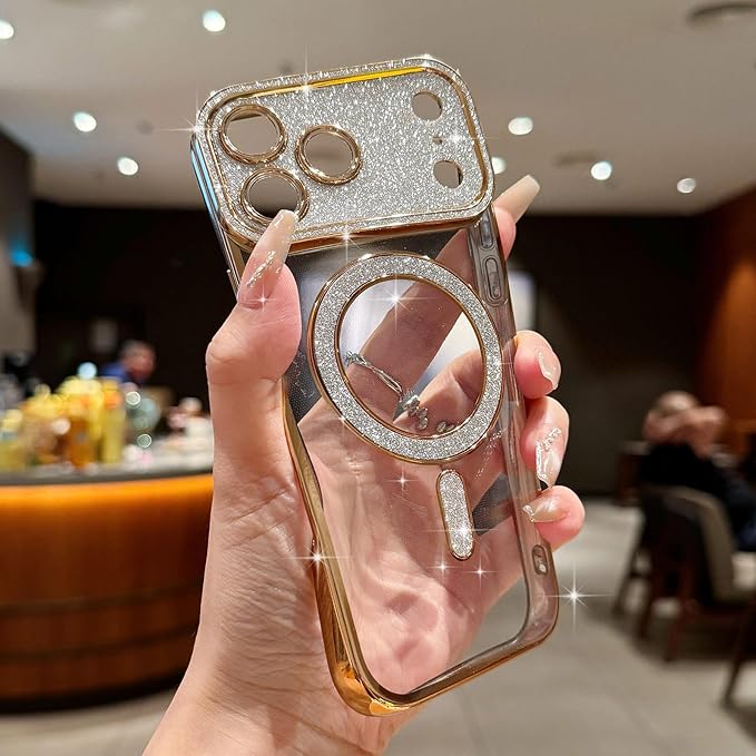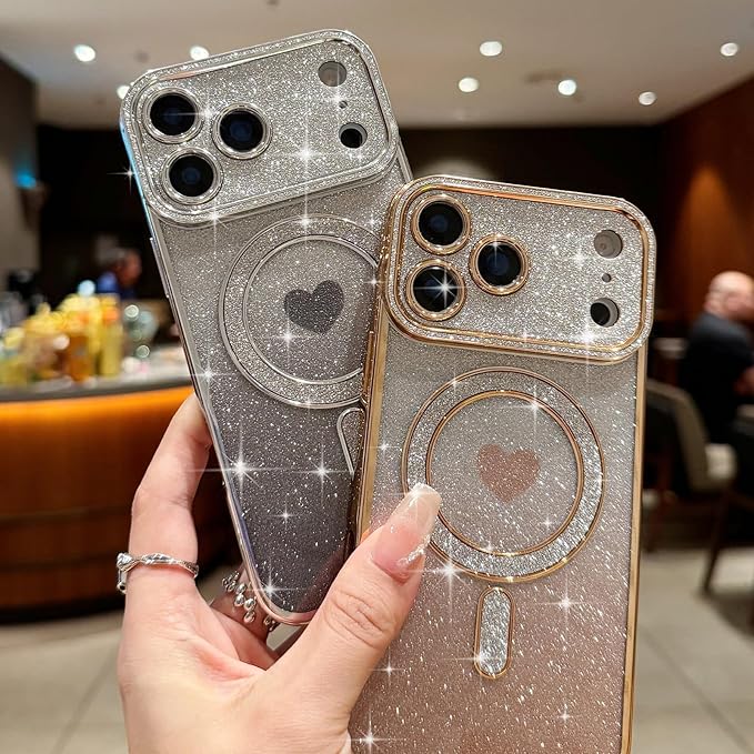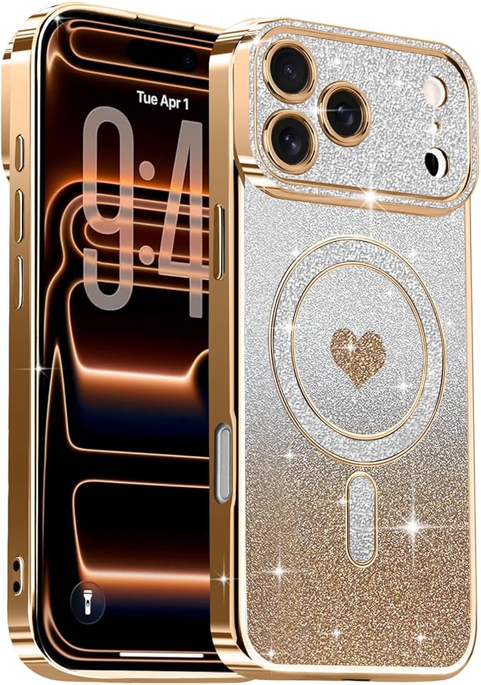 Lafunda iPhone 17 Pro Max 用 ケース キラキラ Magsafe対応 グラデーション ラメ 透明 スマホケース 女の子 かわいい ハート柄 メッキ加工 軽薄型 衝撃吸収 カメラ保護 ワイヤレス充電対応 アイフォン 17 Pro Max 用携帯 マグネットカバー ゴールド