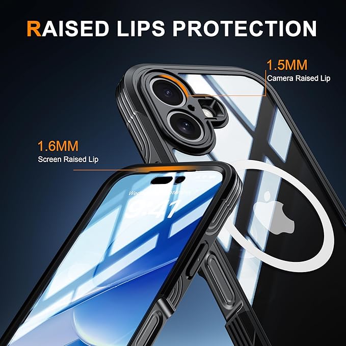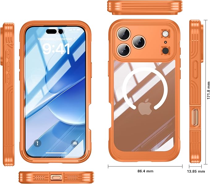 iPhone 17 Pro Max 用ケース Magsafe対応 ガラスフィルム付き 前後 クリアカバー 液晶保護 フルカバー 全面保護 嵌め込み式 防塵 軽量 滑り止め 米軍MIL規格取得 耐衝撃 アウトドア、オレンジ