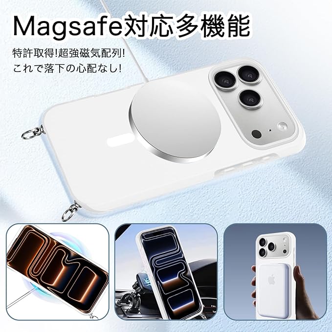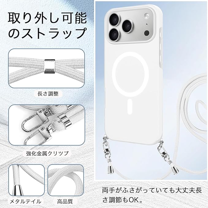 iPhone 17 Pro Max 用の ケース MagSafe対応 バンパー ショルダー ストラップ付き 肩掛け 斜めかけ iPhone 17Pro Max 用の カバー 韓国 アイフォン17 プロ MAX スマホケース 縄掛け (ホワイト)