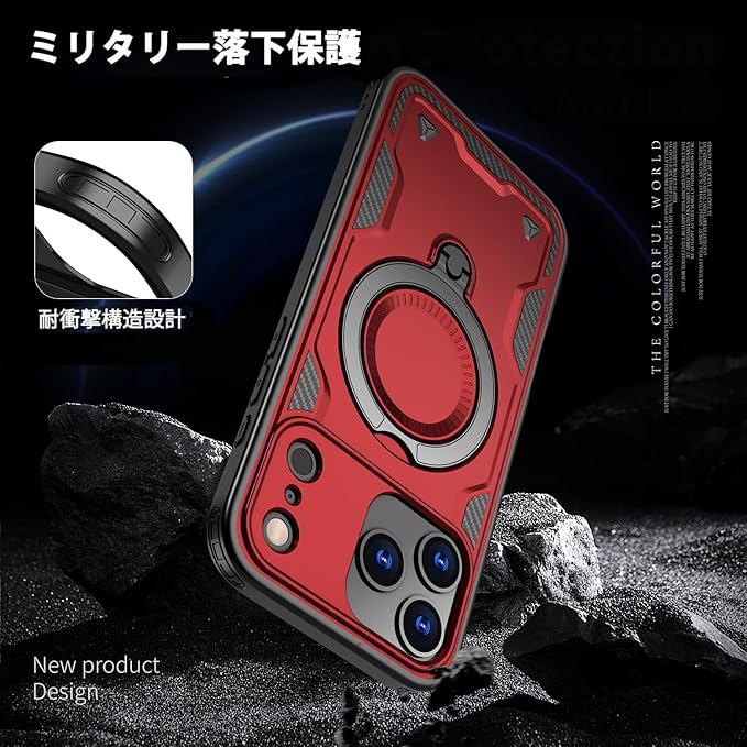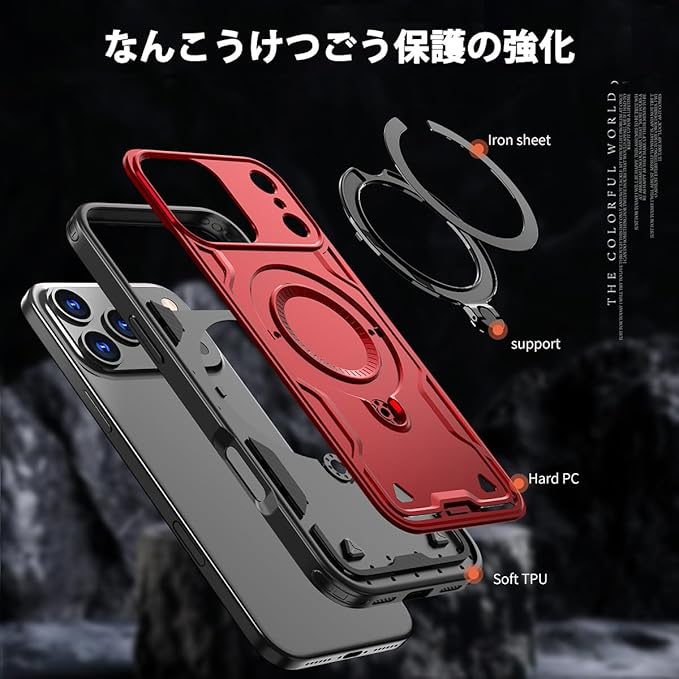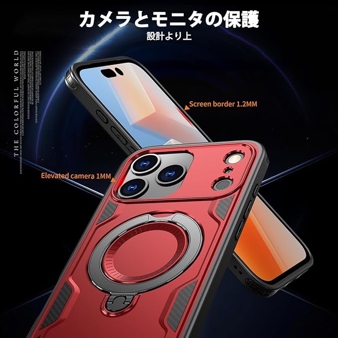 iPhone 17 Pro Max 用ケース MagSafe対応 磁気吸着 ワイアレス充電対応 360 回転リング スマホケース 縦横両対応 スタンド機能 米軍MIL規格取得 耐衝撃 Case Cover アイフォン いphone17promax 17プロマックス 対応 背面 カバー レディース メンズ (レッド)