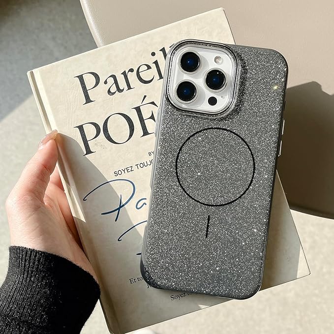 兼用 スマホケース iPhone 17 Pro Max ケース キラキラ ラメ Magsafe対応 おしゃれグリッター 可愛い TPU+PC シンプル マグネット搭載 ワイヤレス充電対応 耐衝撃 黄ばみなし 軽量 薄型 ストラップホール付き (ブラック)