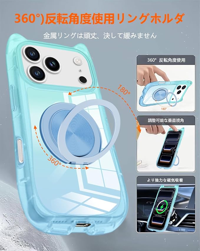 iPhone 17 Pro Max 用 ケース グラデーション 多機能360度回転スタンド 縦横両用 マリング付き [MagSafe 対応] アイフォン17promax スマホケース 可愛い 猫耳 ネコミミ 耐衝撃 滑り止め 黄ばみなし 薄型 軽量 全面保護