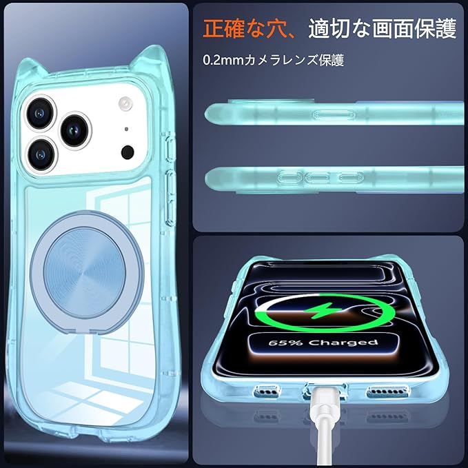 【モデルにぴったりフィット】iPhone 17 Pro Max 専用に設計され、充電ポート、操作ボタン、スピーカーの各カットアウト位置が高精度で合致します。ケース装着時も充電作業、ボタン操作、音声出力がスムーズに行え、機器をしっかり固定しながらも使い勝手を最大限に保ちます。ご購入前に、ご使用のスマホモデルを必ず確認してください。【細かいデザインが超親切】磁気式カーマウントに対応し、置くだけで安定して固定できるため、ドライブ中のナビゲーションも便利です。横置き時にはスタンド機能として使用可能,動画視聴やビデオ通話時に手で持つ手間を省けます。スクリーン周囲とカメラ部分をわずかに盛り上げた設計で、机上への直接接触を防ぎ傷つきを抑制;さらに 4 角に衝撃吸収構造を採用し、落下時の衝撃を緩和するなど、細部まで安心感を追求しています。【高い透明感】高品質 TPU を使用し、一般的な保護ケースより透明度が高く、スマホの本来のデザインと色合いをそのまま楽しめます。クリアケースの裏面には、家族やペットの写真、お気に入りのシールなどを入れて、自分好みのアレンジが可能です。【猫耳デザイン】可愛いデザインアイテムです。猫耳のデザインが立体感に富み、日常の風景に一抹のキュートさを添えてくれます。猫耳のデザインの機能は、いつでもどこでも可愛らしさをアピールできて、街を歩く時や友人と集まる時など、いつも明るい雰囲気を作れます。【品質問題は安心して交換可能】受け取った製品に損傷や汚れがある場合、レビュー投稿前にいつでもお問い合わせください。状況を確認后、新品交換または返金に対応させていただきますので、安心してショッピングをお楽しみいただけます。