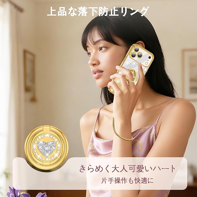iPhone 17 Pro Max ケース ダブルリングスタンド リストバンドブレスレット付き レンズ保護 グリッターカード プレミアム クリア レディース 高級 可愛い ハートデザイン 薄型 軽量 iPhone17 Pro Max 用 スマホケース, 6.9", ゴールド