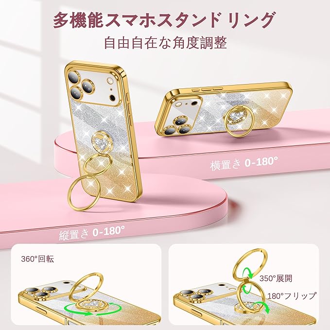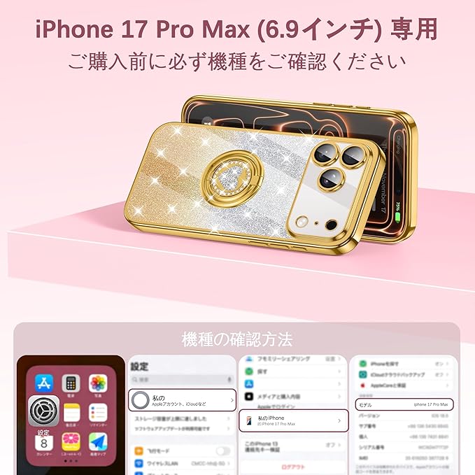 【注意事項】本製品は粘着式デザインのため、MagSafeやワイヤレス充電技術には対応しておりません。iPhone 17 Pro Max 用電話ケース x 1、グリッターカードストック x 1、ブレスレット x 1、スペーサー x 1、レンズプロテクター x 1が含まれています。