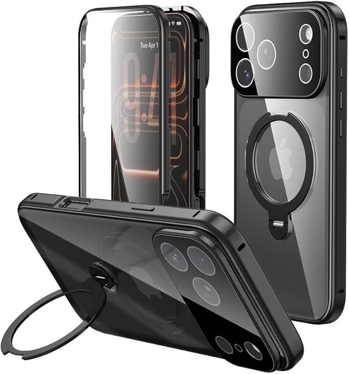【スタンド機能付き・360 定点回転】MagSafe対応 iPhone 17 Pro Max 用 ケース クリア ロック付き 9H強化ガラス PC背面 一体型レンズ保護 両面 アルミバンパー メタルフレーム ワイヤレス充電対応 アイホン17プロマックス 用 カバー スマホケース,ブラック