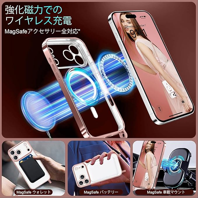 Lafunda iPhone 17 Pro Max 用 ケース クリア MagSafe対応 ショルダー スマホカバー 透明 肩掛け 斜めかけ 縄掛け TPU 薄型 おしゃれ マグネット搭載 耐衝撃 落下防止 長さ調整可能 ワイヤレス充電 アイフォン 17 Pro Max 用 携帯スマホケース ストラップ付き (ピンク)