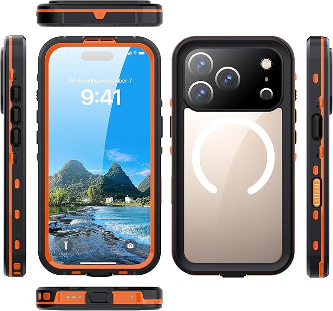 iPhone 17 Pro Max 対応 ケース 完全防水 Magsafe対応 ストラップ付き 防水ケース カバー クリア 透明 アイフォン17promax 用 全面カバー 頑丈 耐衝撃 両面ケース 液晶画面保護 アウトドア ,オレンジ
