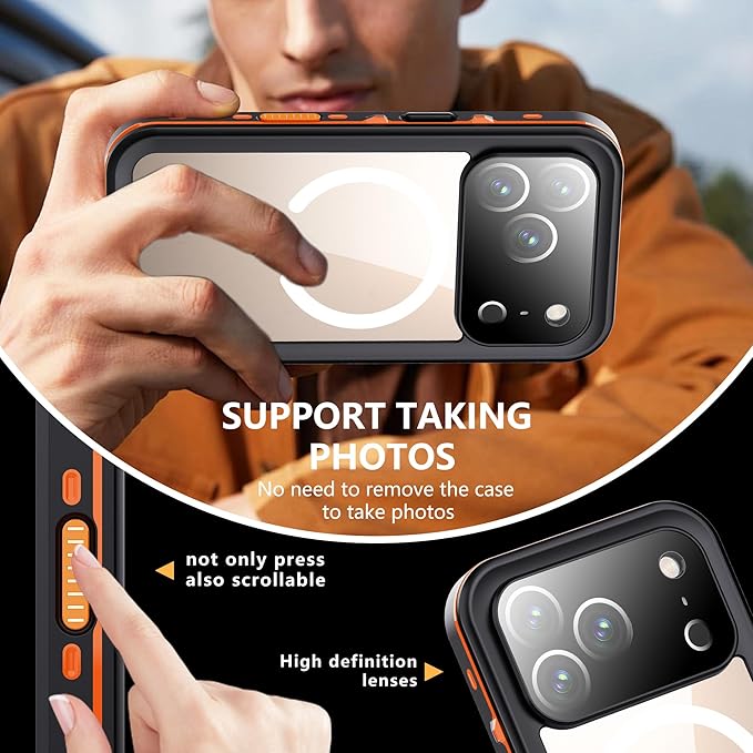iPhone 17 Pro Max 対応 ケース 完全防水 Magsafe対応 ストラップ付き 防水ケース カバー クリア 透明 アイフォン17promax 用 全面カバー 頑丈 耐衝撃 両面ケース 液晶画面保護 アウトドア,オレンジ