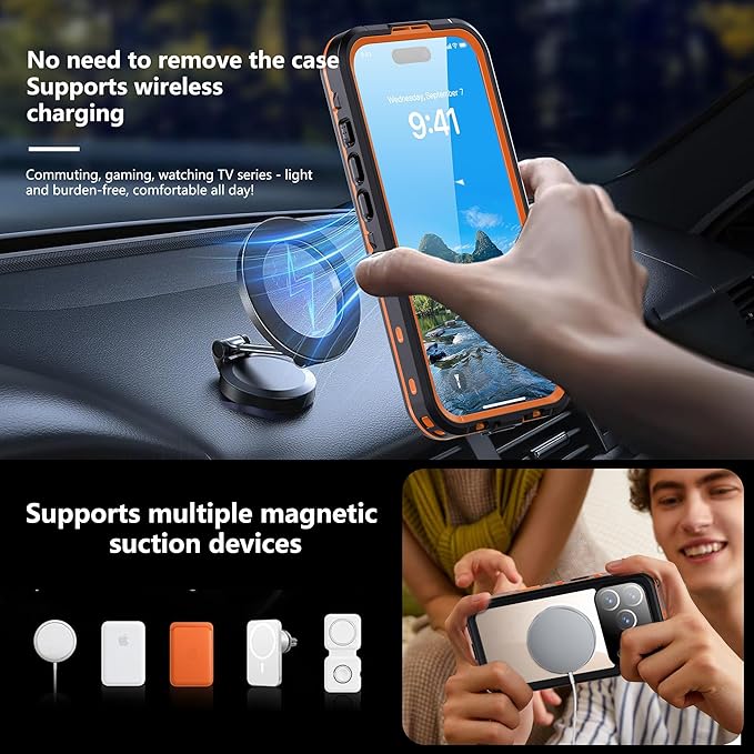 無線QI充電対応 : ケースをつけたままワイヤレスマグセーフ充電対応、薄くて軽い、防水ケースですが、普段使いでも違和感なし。