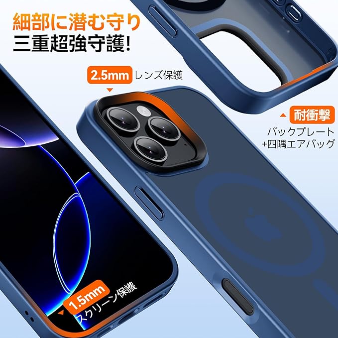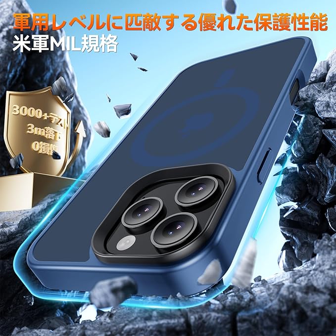 iPhone 16 Pro Max 用 ケース MagSafe対応 【米軍規格・全面保護・耐衝撃】マグネット搭載、ワイアレス充電対応 半透明マット仕上げの背面、滑り止め ストラップホール付き スマホケース iphone 16 Pro Max 6.9インチ用 (ブルー)