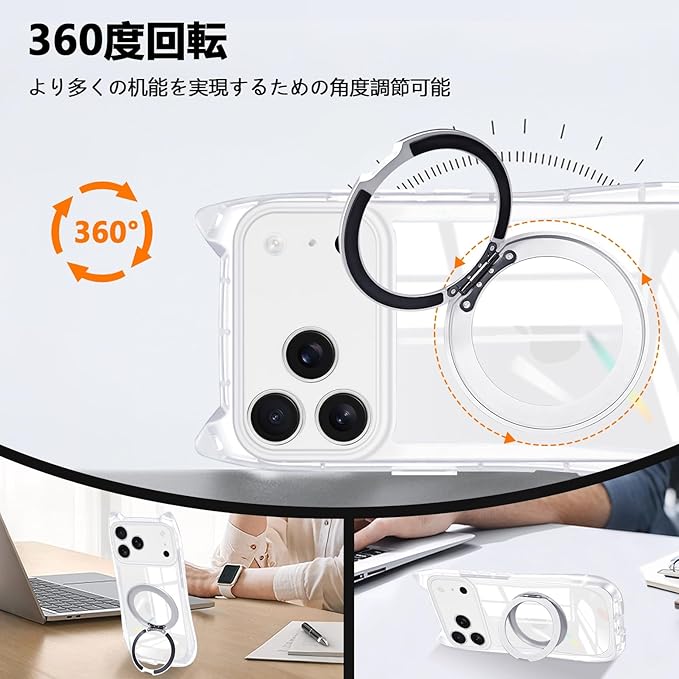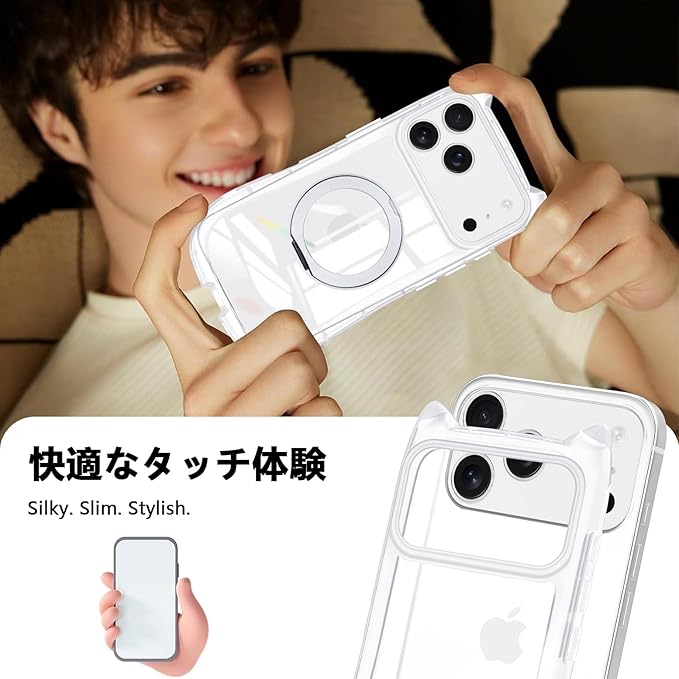 iPhone 17 Pro Max 用 ケース クリア リング付き 隠しスタンド 猫耳 ネコミミ アイフォン17 pro max ケース MagSafe対応 360度回転スタンド リング付き iphone 17 pro maxスマホケース TPU 縦横両対応 多機能 マグネット搭載 車載対応 可愛い 猫柄 カバー 韓国 おしゃれ アニメ 耐衝撃 黄変なし 米軍MIL規格 全面保護(ホワイト)