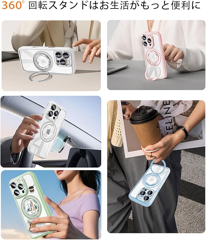 【360度回転スタンド&MagSafe対応】 業界トップクラスの耐久テスト(5万回回転試験)をクリアした金属リングスタンド。180度での平坦設置や360度自由調整が可能、縦置き・横置き・任意角度調整出来て、角度自由。内蔵38個の超薄型マグネットでMagSafe充電や車載ホルダー・冷蔵庫など鉄製面への着脱も吸着も便利。