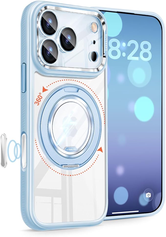 iPhone 17 ProMax用ケースMagsafe対応 マグネットリングスタンド付き 薄型 クリアアクリル背面 シリコン耐衝撃 滑り止め カメラコントロールボタン 着脱式カメラカバー かわいいアイフォン17プロマックスケース アイスブルー
