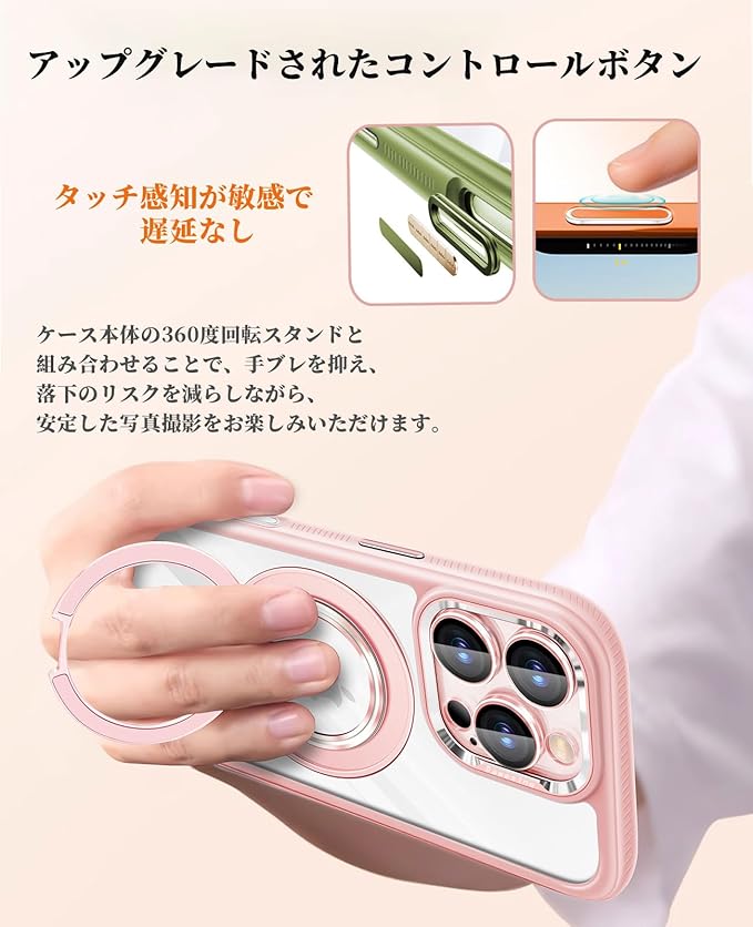 【対応機種&製品特徴】 For iPhone 17 ProMaxケース(6.9インチ)。360度回転スタンド付き、マグネット搭載でMagSafe対応、このアイフォンケースのハイライトは取り外し可能なカメラカバー・御洒落でキラキラ・クリア背面・肌触りオイル塗装で黄変防止&汚れ防止、機能性と保護性能を両立したこだわりのiPhoneケース。商品について御不明な点や不具合がございましたらいつでもお気軽に連絡ください。
