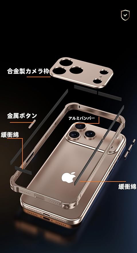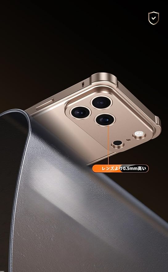アルミ合金カメラ枠付き- カメラ枠には耐久性と高級感に優れたアルミ合金素材を使用。落下や衝撃からレンズ部分をしっかりガードし、さらに美しい光沢がデザインのアクセントにもなっています。