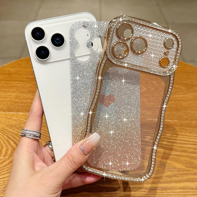 Teageo 用の iPhone 17 Pro Max ケース キラキラ 透明 ウェーブ スマホケース 女性 可愛い グラデーション グリッターカード ダイヤモンド TPU 薄型 軽量 耐衝撃 波型 滑り止め 用の アイフォン 17 Pro Max カバー (ゴールド)