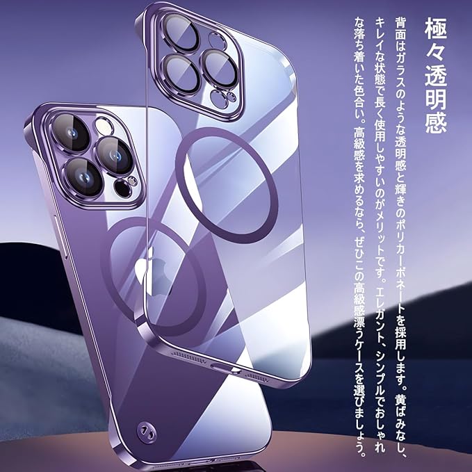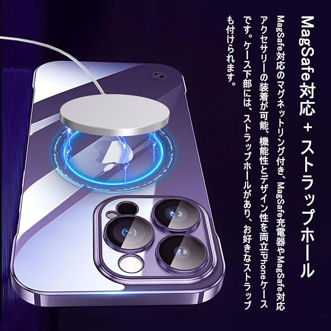 【超薄型フレームレス・上質なPC素材】、【一体型カメラレンズ保護】、【極々透明感】、【MagSafe対応+ストラップホール】、【美しいデザイン】