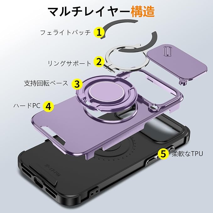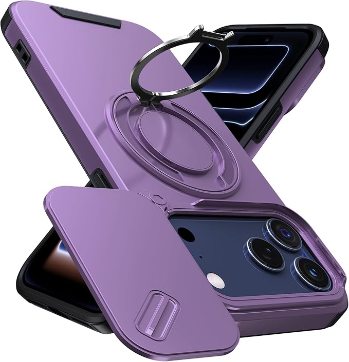 対応 iPhone 17 Pro Max 用 ケース リング付き スライド式カメラカバー 隠しスタンド 耐衝撃 スタンド機能 縦横両対応 車載ホルダー PC TPUバンパー 防塵 人気 落下防止 滑り止め 指紋防止 アイフォン 17 プロ マックス カバー 紫 MJJ-1065-16-04