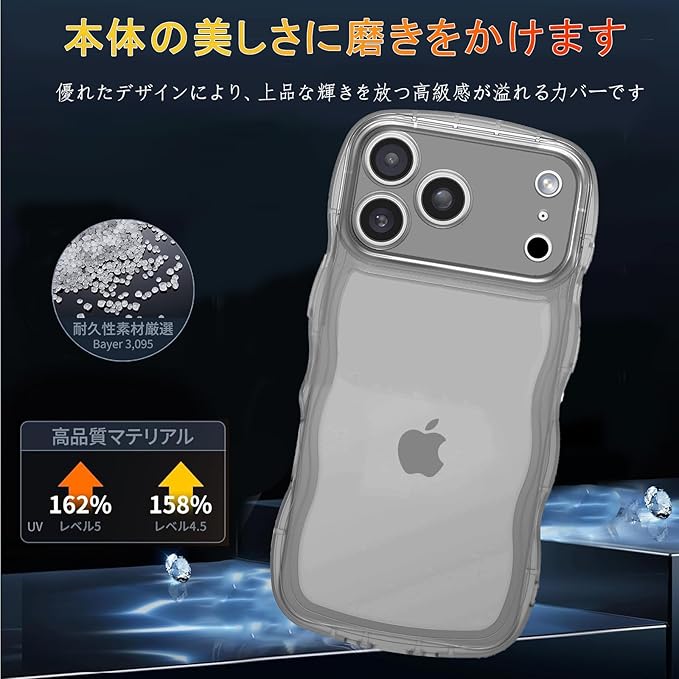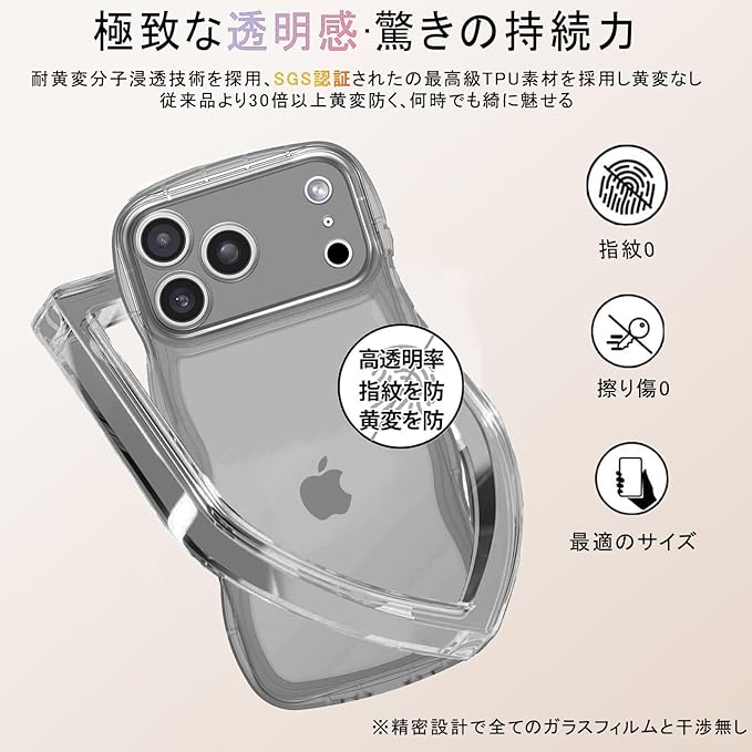 【かわいい波枠】これはiPhone 17 Pro Max ケース用のクリアユニークな境界デザインで。かわいい波状のボーダーが指にフィットし、摩擦が高まります。透明度が高く、黄変防止を実現しました、スマホ本体の美しさを完璧に見せる、携帯電話をよりファッショナブルで目を引くようにします。ファッションと実用性の完璧な組み合わせ。柔らかTPU素材なので着脱簡単です。 「ご注意:背面には写真などを入ることができる、厚みのあるアクリルスタンドは入りません。」