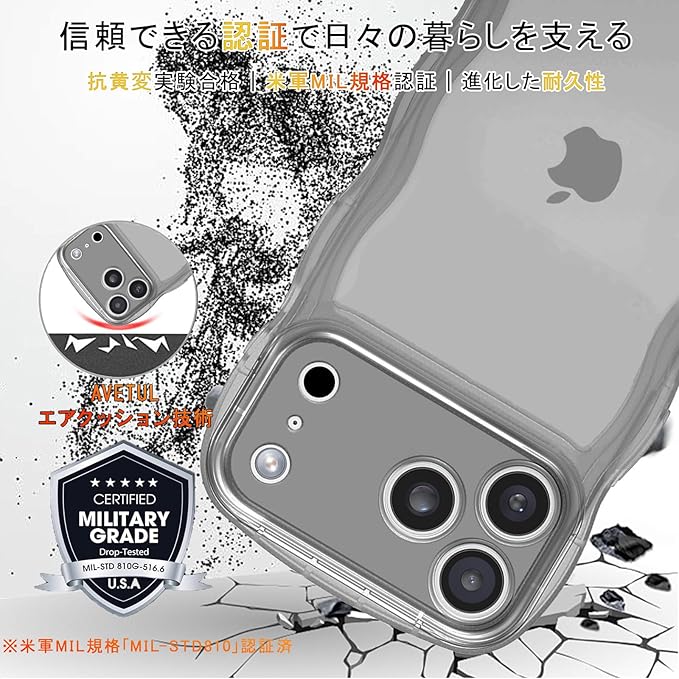 【液晶画面とカメラレンズを確かに保護】デバイスの薄さを維持しつつ、しっかり保護できる高さで設計されています。カメラレンズと液晶画面よりフチを高く設計して予期せぬキズから守ります。液晶画面ガラスフィルムを付着した場合にもフィルムをキズと衝撃から保護できます。iPhone 17 Pro Maxのカメラレンズより1.5ミリ高い立ち上がって、有効的に擦り傷を防ぎます。液晶画面より約1.5ミリ高く設計され地面と接触するのを防止、外部との擦り傷を避けるし、併用のガラスフィルムまでも保護できます。精確なホールデザインは携帯にもジャストフィツトしています。 【品質保証サービス】商品についてのお問い合わせは、24時間・365日迅速な対応で受け付けております!ご購入前、利用中に何かございましたら、何時でもお気軽にお問い合わせてください。ご連絡の方法:アカウントサービス内の「アカウントサービス」→「注文履歴」→「販売元」→「質問する」から、ご遠慮なくお問合せ下さいますようお願い申し上げます。AVETULは、お客様にご満足いただけるよう努めてまいります。