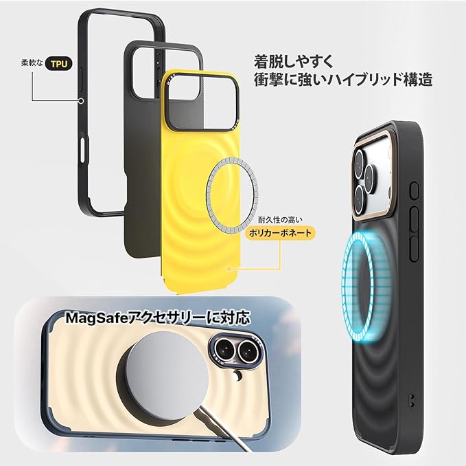 ポリカーボネート背面とTPUベゼルのハイブリッド素材で、高耐久、着脱もスムーズ