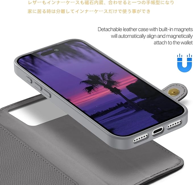 インナーケースMagsafe対応:レザー部分を外すとワイヤレス充電に対応しており、簡単に内蔵の磁力で固定でき、車載ホルダーもスムーズに対応できます。レザーケースにはストラップ付きなので、落下防止対策を施したり、好きなアクセサリーを付けたりすることも可能です。