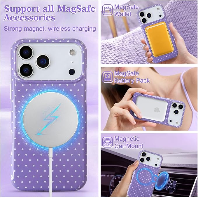 MagSafe対応:対応iPhone 17 Pro Max用ポルカドット磁気ケースは強力な内蔵マグネットリングを搭載。これにより、より強力で安全、高速かつ簡単なワイヤレス充電を実現し、MagSafeアクセサリ、磁気ウォレット、カーマウント、その他の磁気ワイヤレス充電器への確実な固定を可能にします。