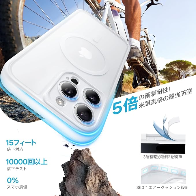 【いphone16pro max ケース軍規級360 防護】MIL-STD-810G認証と衝撃吸収構造米軍規格を満たす強力な防護性能を誇り、3.85メートルからの1万回落下テストをクリア。TPU+PCの3層緩衝構造とAirGuardクッションコーナーにより、99%以上の衝撃エネルギーを吸収。画面周辺1.5mm、カメラ周辺2.5mmの隆起設計に加え、全面保護フレームでレンズを完全守り、日常の置き忘れや運動中の衝突から機体を保護します。